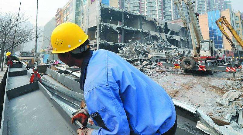 ⑥ 拆除建筑物時,不允許多人在地面上堆放材料。大型或較重的材料被拆除,由起重機械吊下,然后運走。破碎的物料應由溜槽滑落,拆下的物料應及時清理運輸。