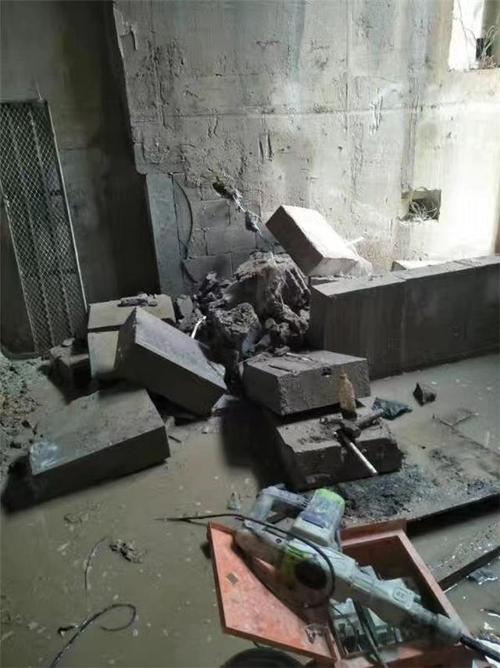 切割墻機(jī)時(shí),先橫向切割冉縱向切割,最后切割底部,冷卻刀頭,直到墻完全切割。打孔機(jī)的打孔也是先打橫孔,再打縱孔。打孔后,用大錘拆除中間墻,有效控制墻體損壞。