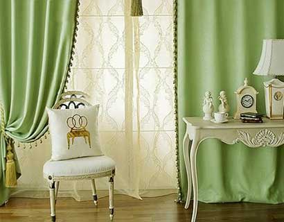 綠色是大自然的色彩,給人的感覺是清新舒適而自然,適合田園、現代等裝修風格,綠色窗簾搭配在空間里,也會讓空間更加生機與活力氣息。
